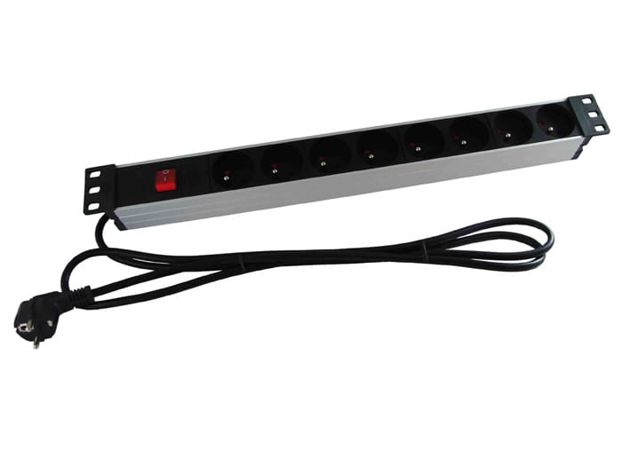Listwa ze srebrną obudową aluminiową i uchwytami dostosowana do montażu poziomego w szafach RACK.