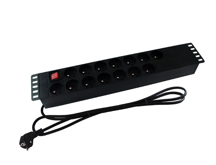 Listwa z czarną obudową aluminiową i uchwytami dostosowana do montażu poziomego w szafach RACK.