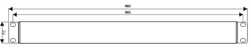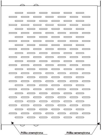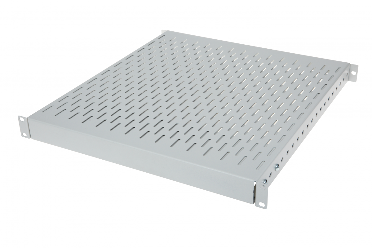 Półka rozsuwana o wysokości 1U mocowana z przodu i z tyłu, wykonana z blachy stalowej ocynkowanej z  perforacją. Półka regulowana w zakresie 650-600 mm, regulacja głębokości skokowo co 25 mm.
