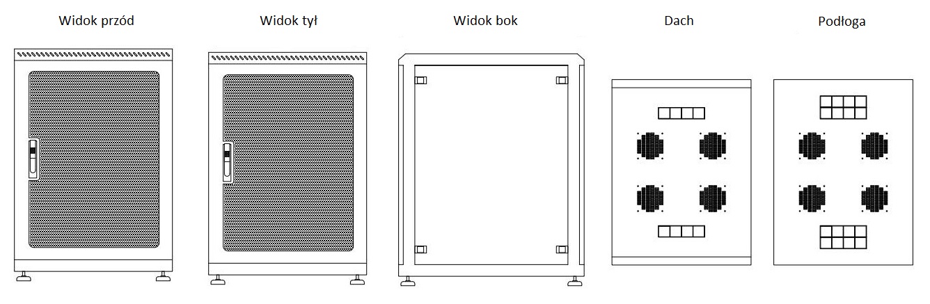 • Dach: Dach z perforacją w przedniej i tylnej części, usprawniającą wentylację i chłodzenie wnętrza szafy. Posiada dwa rzędy mikromostków do wprowadzenia okablowania oraz cztery otwory 120 x 120 mm, w których można zamontować wentylatory z opcjonalnym termostatem.