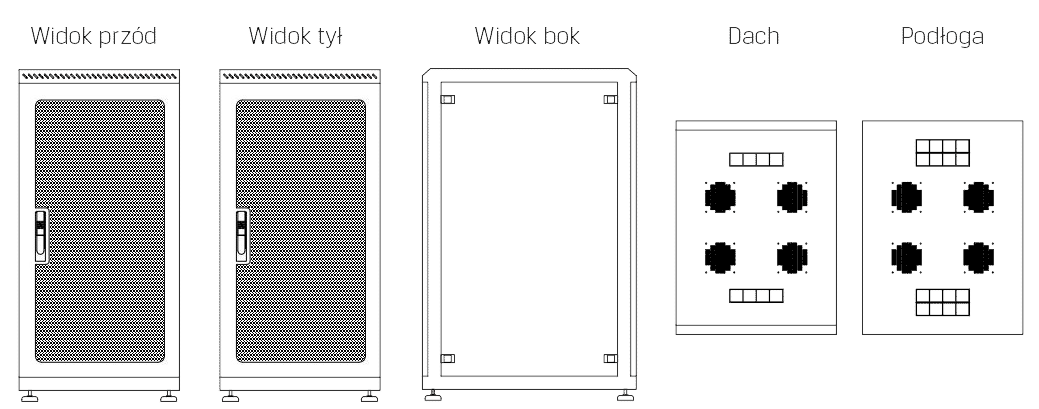 *Zdjęcie poglądowe. Podana cena dotyczy zakupu szafy serwerowej na nóżkach poziomujących. Dodatkowe akcesoria (kółka)dostępne w produktach powiązanych.