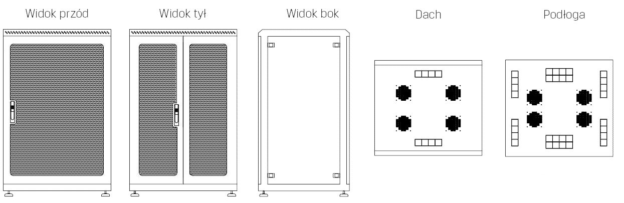 • Podłoga: Przystosowana do wprowadzenia okablowania (dwa rzędy mikromostków) oraz podłączenia wentylacji (standardowo cztery otwory 120 x 120 mm przystosowane do montażu wentylatorów).